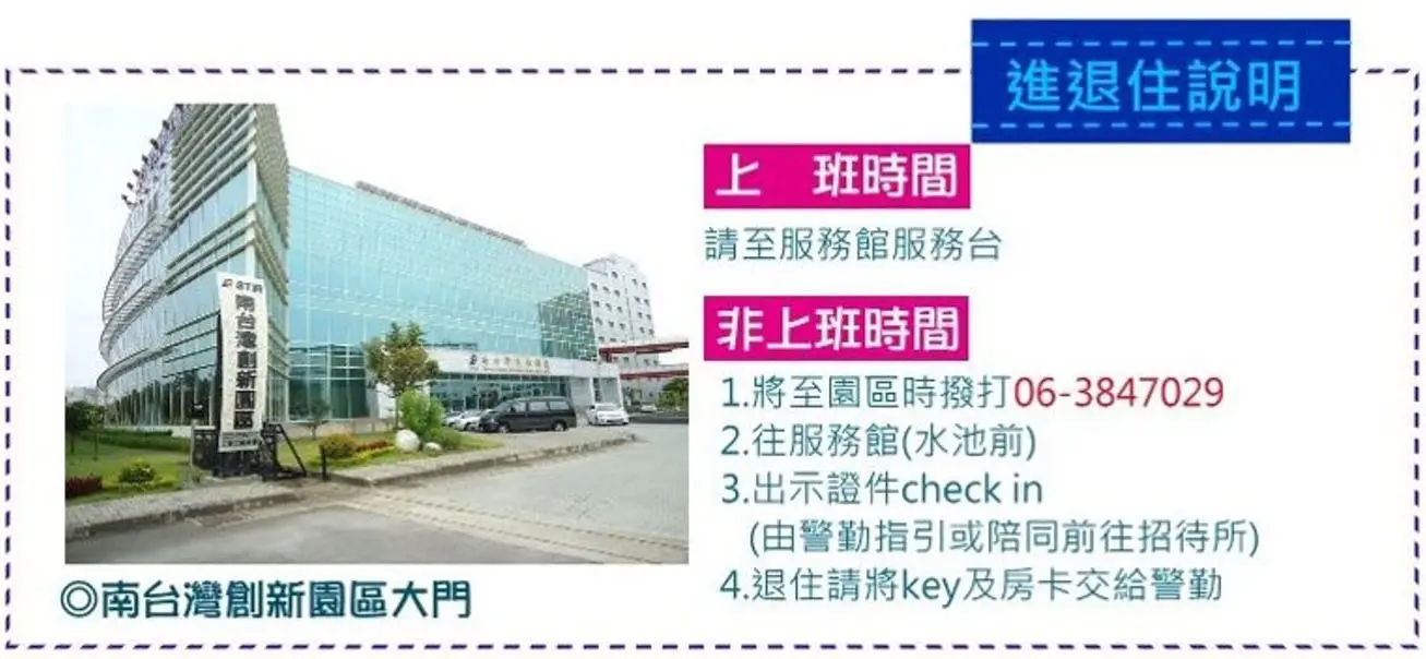 - 每日下午3:00以後,無最晚入住時間限制請於進住時出示相關證件(工研院識別證、身分證、護照等有效證件)。